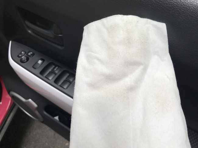 こちらも一見それほど汚れているようには見えませんでしたが、運転席の座面と背もたれ部分を軽く拭いただけでシートに汚れがしっかり付いていました。