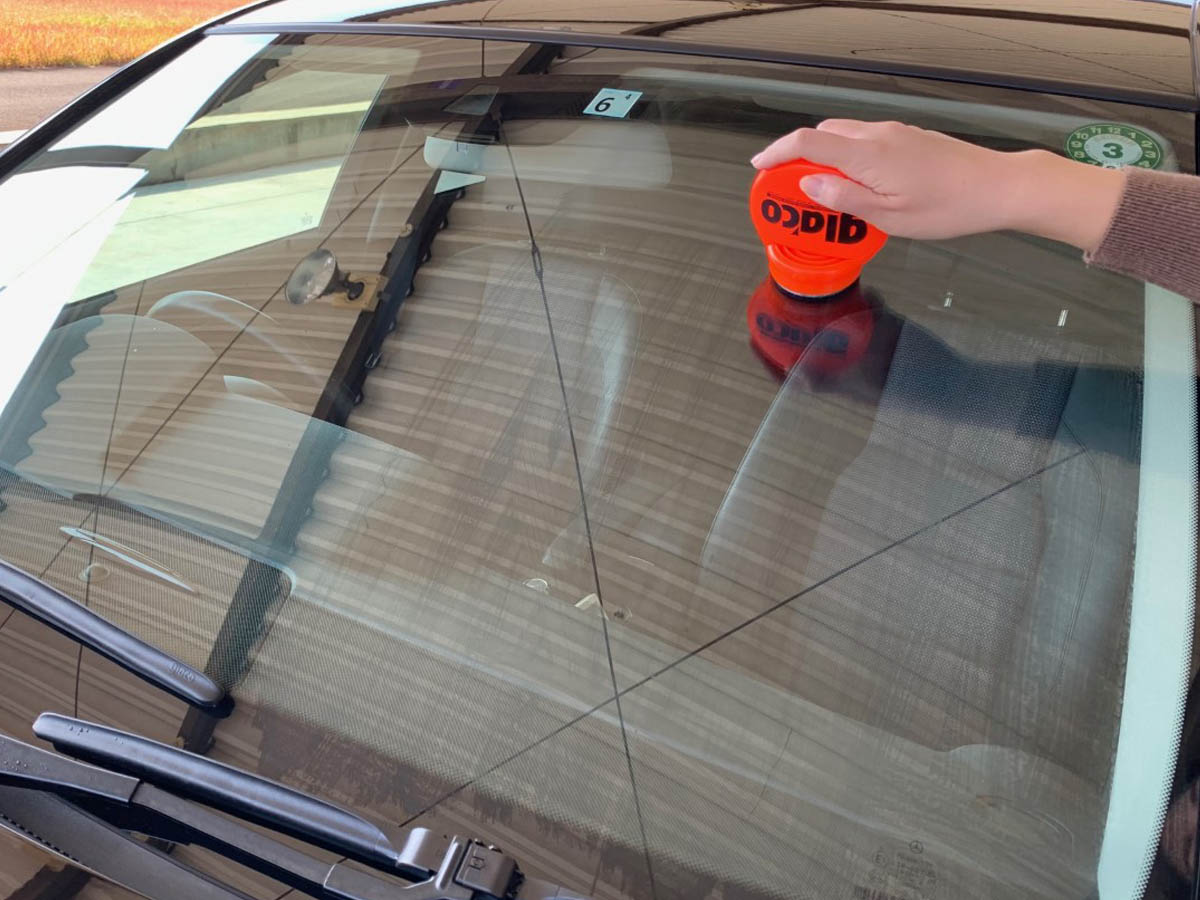 それではガラス撥水剤の施工作業に移ります!尚、塗り込みタイプを使用する時は、乾いたガラスに使用していきますので、水滴はしっかりと拭き取ってください!