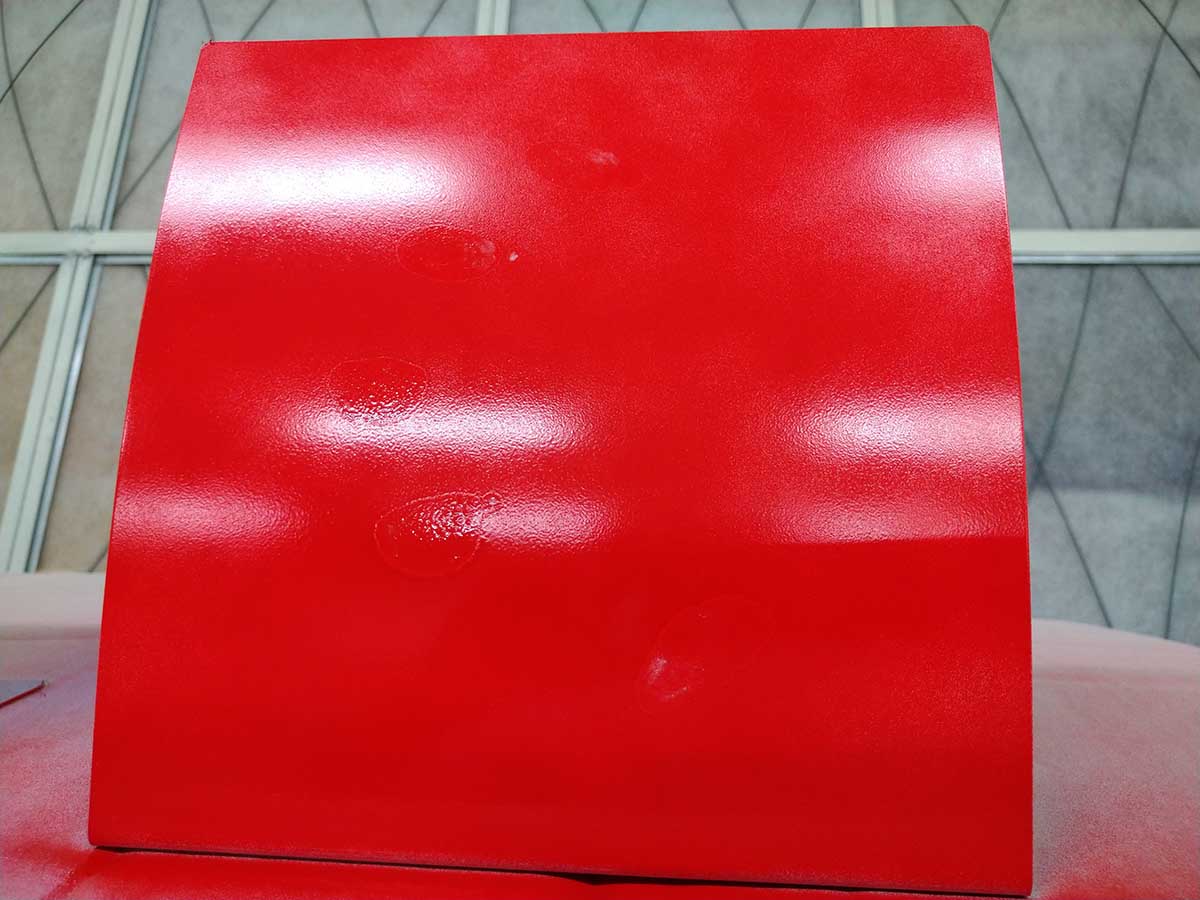 左側の「シリコンオフ」での脱脂を行った塗装板はキレイに仕上がりましたが、右側の脱脂を行わなかった方は、塗料を弾き、そのまま塗り重ねられたことで塗料がダマになって、クレーターみたいな仕上がりとなってしまいました・・・