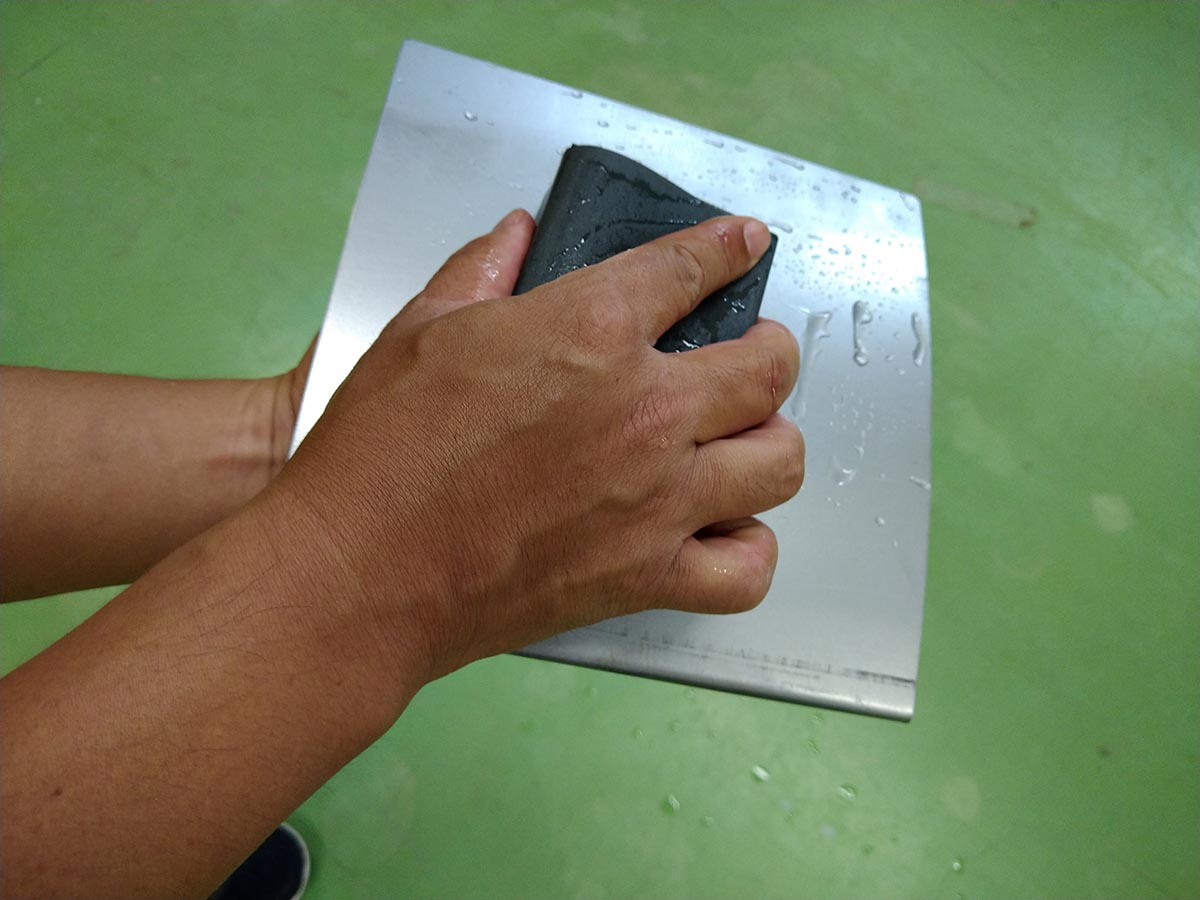 補修工程において、対象面を作業中に手で触るケースがよくありますが、実はそのたびに手についている脂分が対象面に付着してしまっているんです。今回はそれを想定しつつ、実験なので分かりやすいように指に少し粘度の高いオイルを塗って