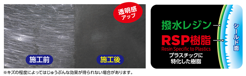 プラスチックに特化した樹脂が細かいキズを埋め、シールドの透明感がアップします。ヘルメットシールド約60枚分への施工が可能。樹脂製ヘッドライト、ウインドスクリーン、二輪用ゴーグルなどの透明樹脂パーツにもご利用いただけます。