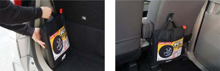 付属の収納バッグサイズは、幅約30cm×高さ約35cm×奥行き約9cmとコンパクトでスリムな設計。お車のトランクに常時保管していても邪魔になりにくく、『モビルシュシュ』はウインタードライブでのいざという時の備えとしてもおすすめです。