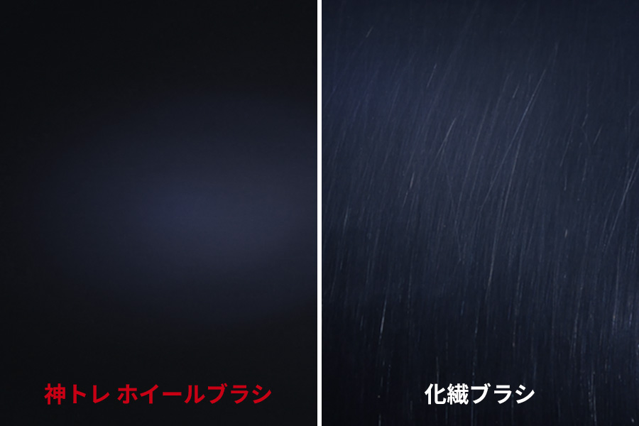 毛先にホイールクリーナーを含ませ100往復した結果、化繊ブラシ側にキズを確認(弊社テストによる)