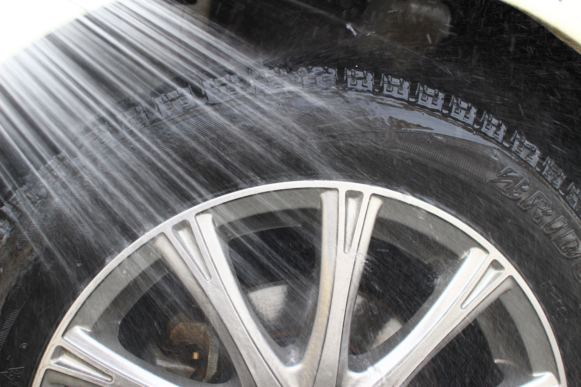 タイヤとホイールについた砂や泥などの傷の原因となる汚れをしっかりと水で洗い流します。